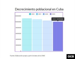 En la publicación “Indicadores Demográficos de Cuba y sus territorios 2023”, del Centro de Estudios de Población y Desarrollo (CEPDE), adscrito a la ONEI, una entidad estatal subordinada al Consejo de Ministros, se muestra en el resumen del balance demográfico que el país tenía una población calculada al cierre de 2020 de 11 millones 181 mil 595 habitantes, que fueron disminuyendo a 10 millones 885 mil 341 (2021); 10 millones 428 mil 733 (2022) y 10 millones 55 mil 968 (2023), esta última, una cifra similar a la de 1985.