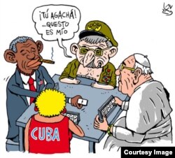 En una de las caricaturas todos los personajes son pingüinos que pasean frente al Capitolio de La Habana y uno dice: “Lo peor del descongelamiento es seguir siendo pingüino”.
